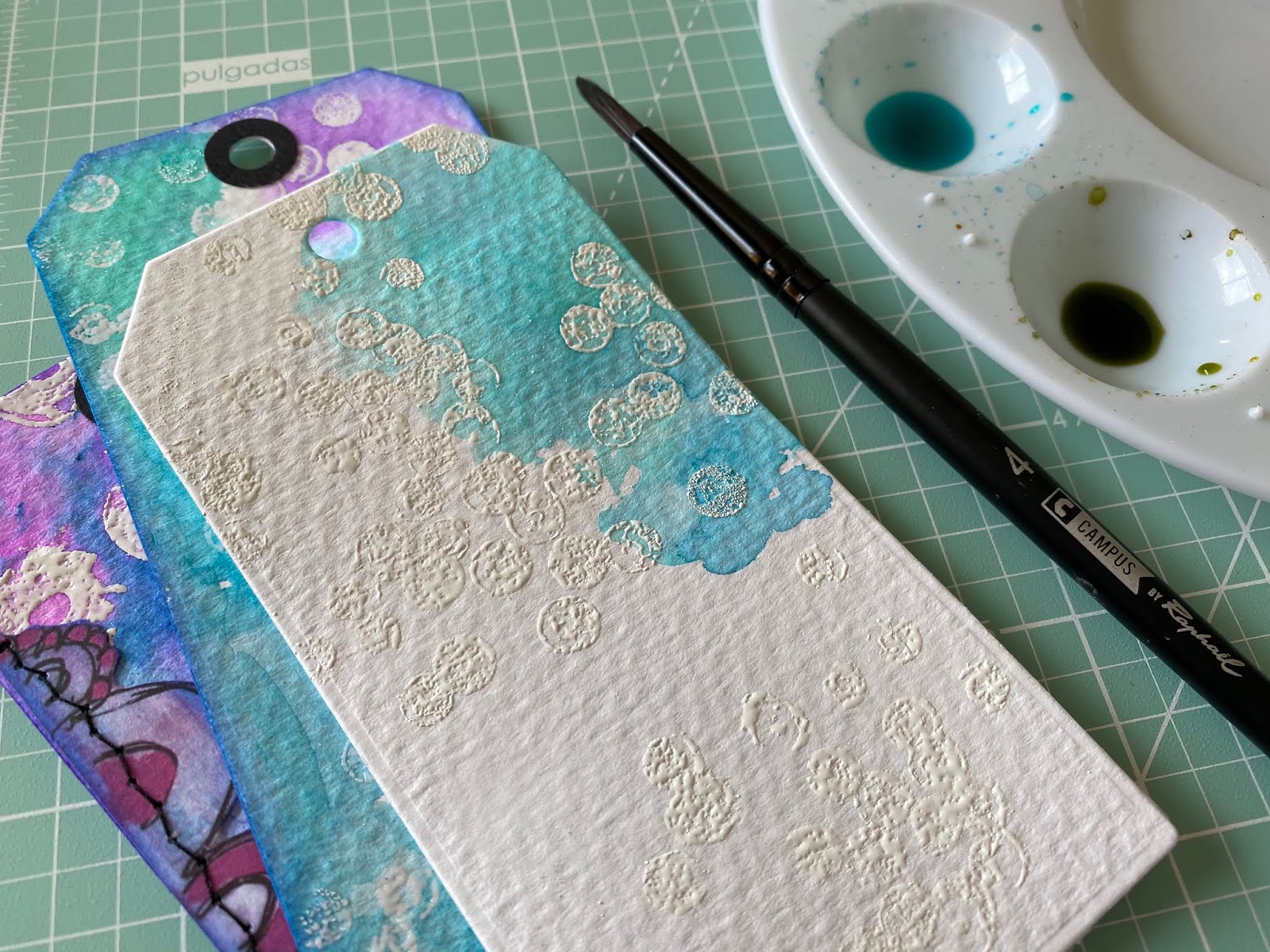 El siguiente paso es troquelar en papel de acuarela círculos y ayudándonos de un pincel de abanico, aplicamos pigmentos.