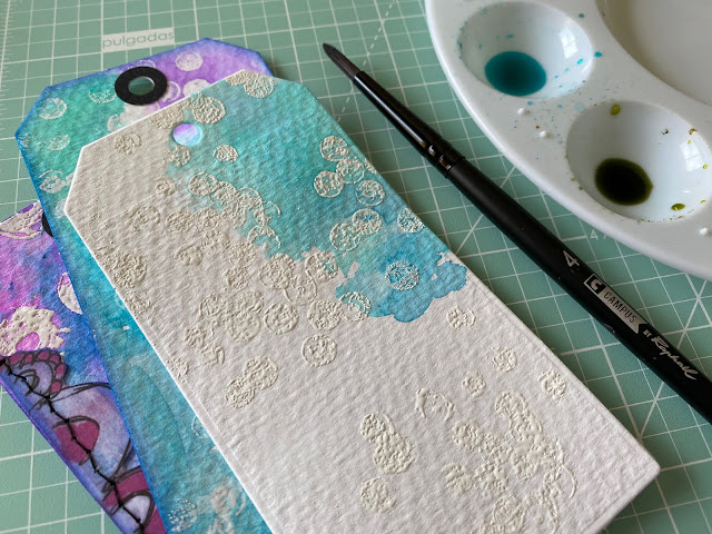 Para el siguiente paso, necesitamos que nuestra tarjeta este totalmente seca, elegimos un sello de fondo, aplicamos tinta de embossing (utilizo VersaMark) , estampamos, aplicamos los polvos de emboss y fundimos ayudándonos de una pistola de calor.